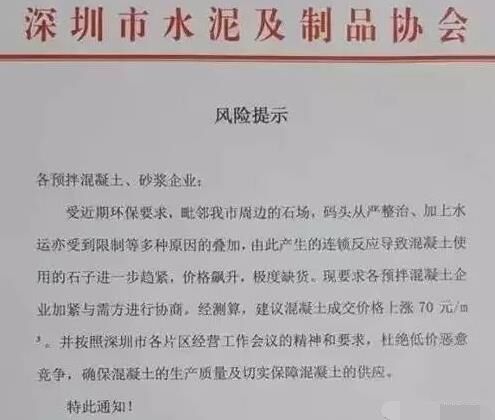 受近期商品混凝土原材料(碎石、砂)持續(xù)漲價的影響,深圳市水泥及制品協(xié)會終于發(fā)布商品混凝土、預拌砂漿企業(yè)風險提示函,表示,因原材料價格持續(xù)上漲,商品混凝土價格建議,上調(diào)70元/立方米。目前,深圳市及周邊地區(qū)大多數(shù)混凝土企業(yè)混凝土價格已經(jīng)上調(diào),瘋狂的石頭再次上演【漲、漲、漲】何時能夠穩(wěn)定一來,還有待觀望。