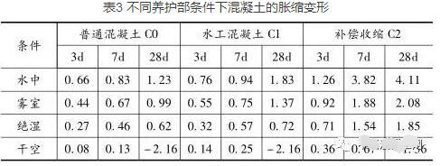 從表3中可以得出以下結(jié)果:(1)如果在條件相同的情況下,在水中養(yǎng)護(hù)的混凝土的變形>在霧室中養(yǎng)護(hù)的混凝土的變形>在絕濕條件下養(yǎng)護(hù)的混凝土的變形>在干空條件下養(yǎng)護(hù)的混凝土的變形,如果混凝土的養(yǎng)護(hù)時(shí)間少于14天,那么特別容易出現(xiàn)有害裂縫。(2)因?yàn)橛信蛎泟┑拇嬖?,所以補(bǔ)償收縮混凝土的膨脹能力要遠(yuǎn)遠(yuǎn)強(qiáng)于水工混凝土和普通混凝土的膨脹能力。(3)從普通混凝土和水工混凝土養(yǎng)護(hù)3d和7d時(shí)的濕脹狀態(tài)和14d后的干縮狀態(tài)現(xiàn)象中可以看出,混凝土后期回縮問題可以用加強(qiáng)早期養(yǎng)護(hù)的方法來解決。