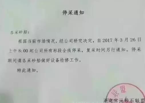 湖南常沅砂石聯(lián)盟近日發(fā)布停采通知,自2017年3月26日上午8:00起,該公司所有標(biāo)段全線停采砂石,復(fù)采時(shí)間待定。這停采了,砂石供應(yīng)可咋辦呢?