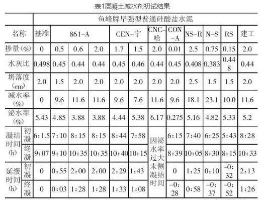 分別準(zhǔn)確稱(chēng)取水泥300g、減水劑300g及水300g,按規(guī)范方法,將水、減水劑及水泥凈漿進(jìn)行拌和。在干凈的玻璃上將拌和好的水泥講講裝入試模中,將試模逐次提起后,對(duì)水泥凈漿的流動(dòng)情況進(jìn)行觀察,并對(duì)水泥凈漿的流動(dòng)性能進(jìn)行測(cè)試,看其能否滿(mǎn)足混凝土泵送要求。同時(shí),對(duì)不同的水泥、不同的減水及減水率大小及摻量進(jìn)行記錄,然后優(yōu)選,如表1所示。