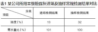 優(yōu)質(zhì)的粉煤灰摻入混凝土可明顯地改善混凝土的和易性,當粉煤灰摻量大于膠材總量的5%~10%時,效果極為明顯?,F(xiàn)今在混凝土實際生產(chǎn)中,粉煤灰摻量往往達到20%,有的甚至高達30%,但混凝土的和易性卻不盡人意。抽取原材料進行檢測時,發(fā)現(xiàn)粉煤灰的檢測結果經(jīng)常不滿足標準要求或者與驗收時的結果相差甚遠?,F(xiàn)以某公司所用Ⅱ級粉煤灰進場及抽樣常規(guī)檢測結果進行對比,見表1。