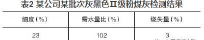 混凝土公司大多數(shù)使用的粉煤灰顏色與水泥相近,多呈灰色;也有部分粉煤灰顏色較深呈灰黑色,這種粉煤灰一般細度較細或含碳量較高。但總會發(fā)現(xiàn)一些深顏色的粉煤灰檢測結果與常理不符,如某公司某批次灰黑色Ⅱ級粉煤灰檢測結果見表2。