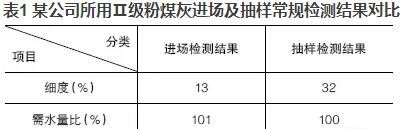 優(yōu)質(zhì)的粉煤灰摻入混凝土可明顯地改善混凝土的和易性,當粉煤灰摻量大于膠材總量的5%~10%時,效果極為明顯?,F(xiàn)今在混凝土實際生產(chǎn)中,粉煤灰摻量往往達到20%,有的甚至高達30%,但混凝土的和易性卻不盡人意。抽取原材料進行檢測時,發(fā)現(xiàn)粉煤灰的檢測結(jié)果經(jīng)常不滿足標準要求或者與驗收時的結(jié)果相差甚遠?,F(xiàn)以某公司所用Ⅱ級粉煤灰進場及抽樣常規(guī)檢測結(jié)果進行對比,見表1。