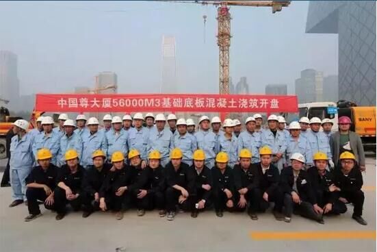 為了保障此次澆筑的順利完成,三一派出了20多名服務(wù)工程師駐守工地,保證每臺(tái)設(shè)備至少有一名服務(wù)工程師進(jìn)行專職服務(wù)。2014年4月27日,在18臺(tái)三一車載泵、20多臺(tái)三一攪拌車的全力保障下,“中國(guó)尊”項(xiàng)目完成了最大底板澆筑,將標(biāo)號(hào)60以上的高粘稠度混凝土一次性泵送到位。這次澆筑持續(xù)了96個(gè)小時(shí),一次性連續(xù)澆筑混凝土總量達(dá)5.6萬立方米,在連續(xù)澆筑期間,實(shí)現(xiàn)了零事故、零投訴,澆筑一次成優(yōu),創(chuàng)造了北京建筑業(yè)的新奇跡。