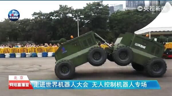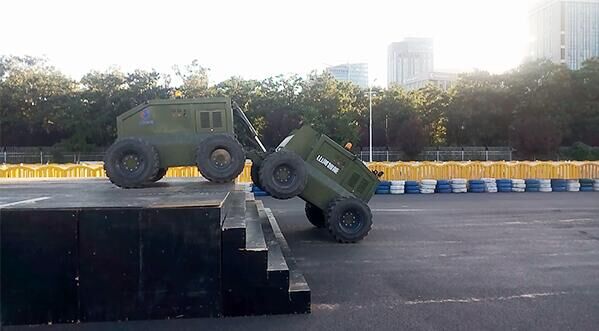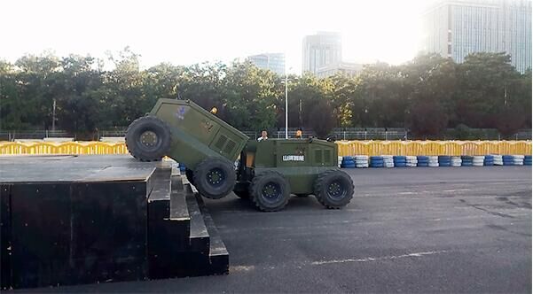 在翻越障礙物的過程中,車體姿態(tài)靈活變化,輕松攀越高臺(tái),現(xiàn)場(chǎng)驚嘆與掌聲不斷。
