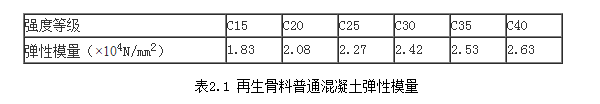 2)僅摻用Ⅰ類再生粗骨料配制的混凝土,其受壓和受拉彈性模量可按現(xiàn)行國家標準《混凝土結構設計規(guī)范》GB 50010的規(guī)定取值;其他類別再生骨料配制的再生骨料混凝土,其彈性模量宜通過試驗確定,在缺乏試驗條件或技術資料時,可按表2.1的規(guī)定取值。