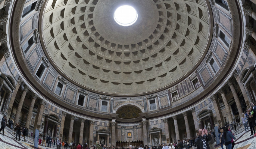 萬神殿下半部為空心圓柱形,從高度一半的地方開始,上半部為半球形的穹頂。 萬神殿的基礎(chǔ)部分底部寬7.3米,墻和穹頂?shù)撞亢襁_(dá)6米,穹頂頂部厚1.5米。為了減輕穹頂?shù)闹亓?,建筑師巧妙地在穹頂?nèi)表面作了28個(gè)凹格,分成5排,同時(shí),在墻上有門的的前提下還開了7個(gè)凹室作為祭龕,這些祭龕里原來放的可能是神像,一些名人的墓穴。
