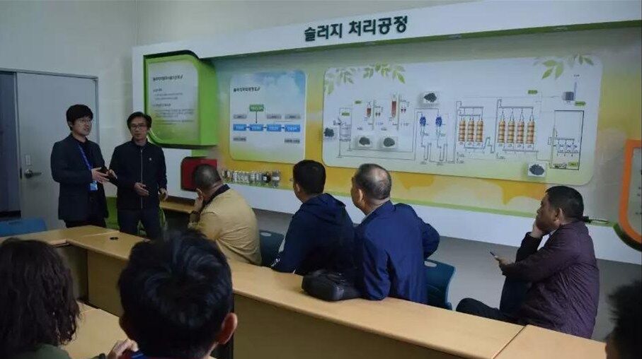 10日下午考察團(tuán)一行到達(dá)韓國(guó)最大的垃圾填埋廠,首先參觀生活食品垃圾運(yùn)輸車輛沖洗設(shè)備,此套設(shè)備由兩組車輛沖洗線構(gòu)成,每條線長(zhǎng)度為50米,當(dāng)車輛駛?cè)胫粮袘?yīng)區(qū)設(shè)備自動(dòng)啟動(dòng)對(duì)車輛全方位立體式?jīng)_洗,沖洗中掉落的異物經(jīng)特制排泥裝置送至中央皮帶輸送機(jī)。車輛完成沖洗后駛出前對(duì)車身噴淋消毒去異味藥劑,最后烘干后離開。每日完成一千車次的清洗消毒工作。