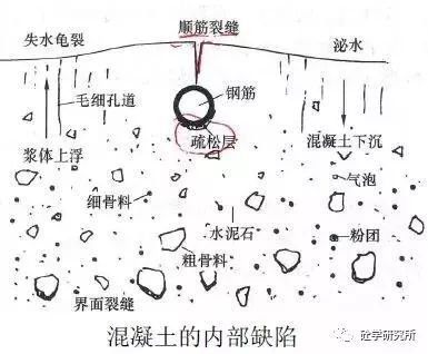 窩水就是泌水的同時(shí)容易在鋼筋下方或石子下側(cè)形成少量的水分聚集。這些缺陷都是后期裂縫產(chǎn)生的薄弱環(huán)節(jié)。混凝土干燥過(guò)程中,這些水分逐漸散失,干燥后留下諸多微小裂隙。