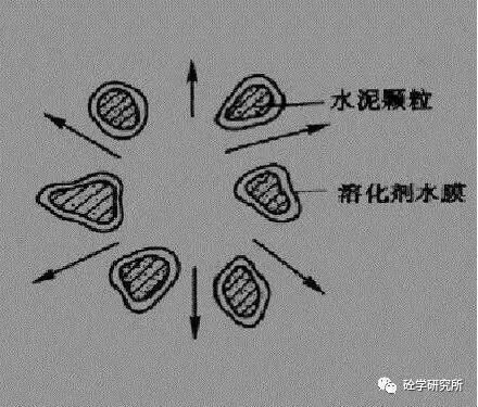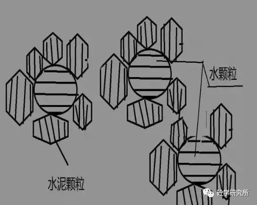 種水泥拌合物狀態(tài)為工地常見狀態(tài),也就是說(shuō)一個(gè)水顆粒被N多的這個(gè)水泥顆粒包裹著。那么水泥顆粒與水泥顆粒之間有非常大的這個(gè)電子吸附效應(yīng),還有內(nèi)摩角度。這樣同等用水量情況下混凝土看上去比較干燥,并且流動(dòng)性不佳。