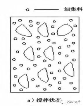 水充分包裹水泥顆粒形成水泥漿—水泥漿液包裹細(xì)集料—細(xì)集料混合物包裹粗集料,在游離水很少的狀態(tài)下靠粘聚作用形成懸浮狀態(tài)。