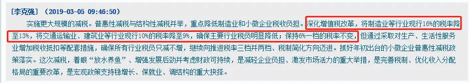 昨日上午!總理在兩會(huì)最新報(bào)告明確:1、將制造業(yè)等行業(yè)原有16%增值稅稅率降為13%,將交通運(yùn)輸、建筑、房地產(chǎn)等行業(yè)現(xiàn)行10%稅率降為9%,保持6%一檔稅率不變。2、下調(diào)城鎮(zhèn)職工基本養(yǎng)老保險(xiǎn)單位繳費(fèi)比例,各地可降至16%!不得自行對(duì)歷史欠費(fèi)進(jìn)行集中清繳!