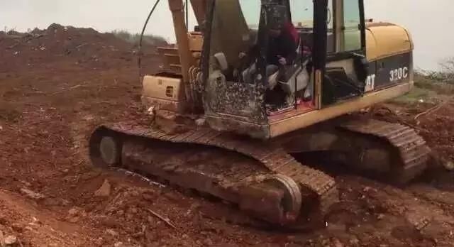 把機(jī)身轉(zhuǎn)向左邊,再次用挖機(jī)把履帶給搞起