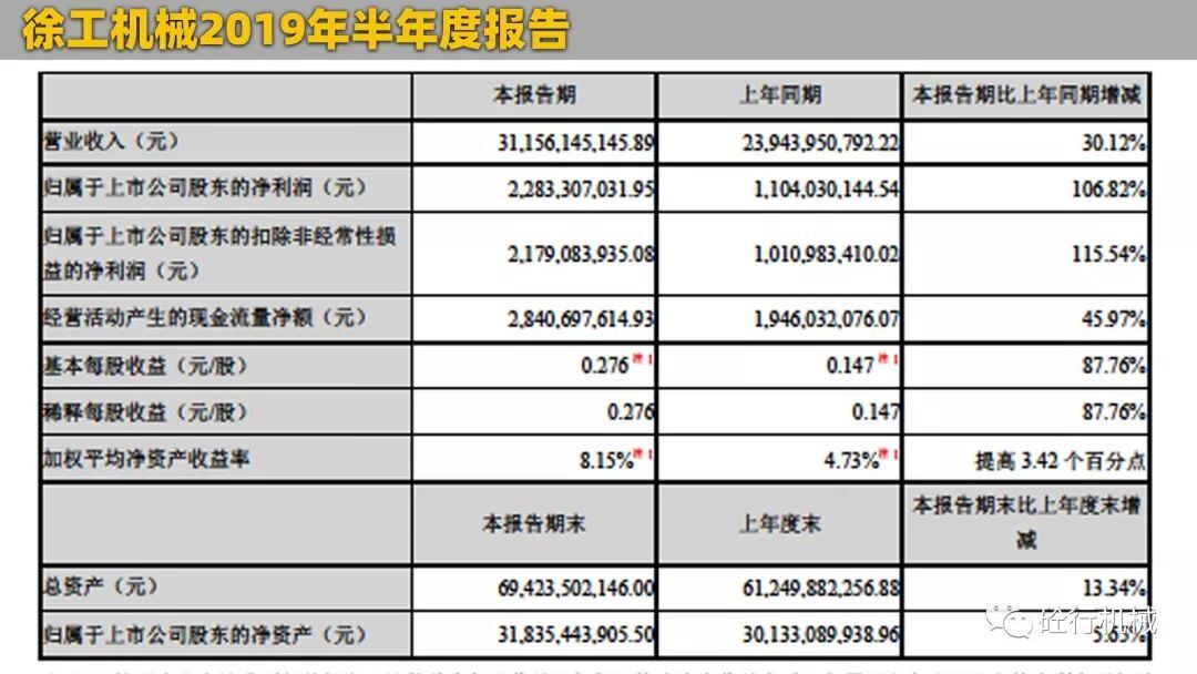 2019年上半年,徐工機械實現(xiàn)營業(yè)總收入311.56億元,同比增長30.12%。其中包括海外收入44.48億元,同比增長20.07%;歸屬于上市公司股東的凈利潤22.83億元,同比增長106.82%。相比較2018年上半年,今年上半年徐工的成績還是很喜人的,特別是在凈利潤這一塊,比去年同期增加了一倍之多。