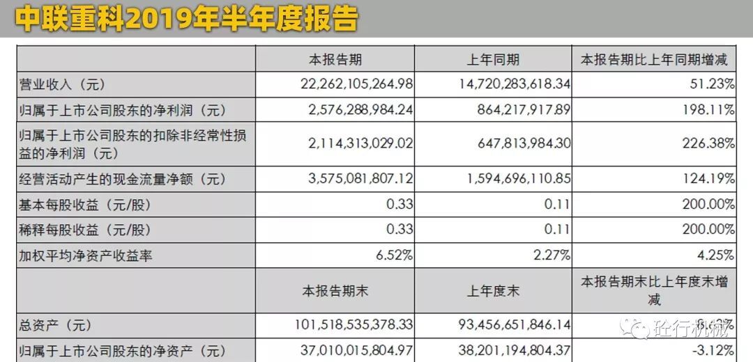 2019年上半年營業(yè)收入:222.62億元8月30日晚,中聯(lián)重科官方發(fā)布了2019年半年度報告。報告顯示,中聯(lián)重科上半年實現(xiàn)營業(yè)總收入222.6億元,同比增長51.23%;包括海外市場實現(xiàn)營業(yè)收入16.84億元,同比增長2.61%。歸屬于上市公司股東的凈利潤25.76億元,同比增長198.11%。相比較上面的徐工機械,雖然總營業(yè)額相差了88個多億,但是,凈利潤比徐工多了2.93億元。所以,從盈利能力來說,中聯(lián)表現(xiàn)比徐工要好。中聯(lián)重科的優(yōu)勢產(chǎn)業(yè)主要集中在混凝土機械、塔式起重機械、環(huán)衛(wèi)機械、農(nóng)業(yè)機械這四個領(lǐng)域為主,其中,建筑起重機械、長臂架泵車保持行業(yè)第一,汽車起重機國內(nèi)市場份額較年初增長6.8%。從目前中聯(lián)的發(fā)展趨勢來看,也在積極的擴展高空作業(yè)平臺、土方機械、機制砂、干混砂漿、噴射機械手等新興業(yè)務(wù)。與此同時,中聯(lián)重科目前也在積極轉(zhuǎn)型,打造人工智能和智能制造,中聯(lián)重科塔機智能工廠穩(wěn)步達產(chǎn),高空作業(yè)平臺臂式智能產(chǎn)線實現(xiàn)量產(chǎn),攪拌車智能制造產(chǎn)業(yè)園、液壓關(guān)鍵元件產(chǎn)業(yè)園處于規(guī)劃建設(shè)中。作為老牌的國產(chǎn)工程機械品牌,中聯(lián)重科一直以來擁有很好的品牌口碑,特別是在混凝土機械領(lǐng)域,擁有眾多的明星產(chǎn)品,碳纖維長臂架泵車,國內(nèi)首創(chuàng),大受市場歡迎。