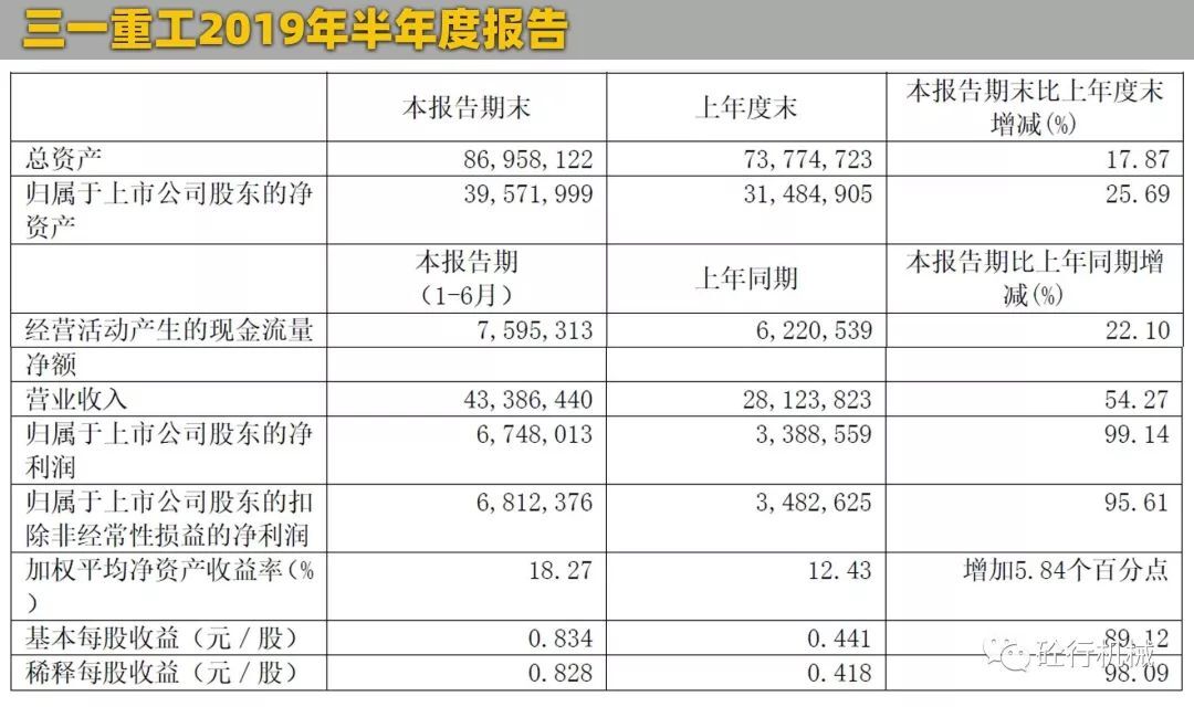 8月29日晚,三一重工官方發(fā)布了其2019年上半年業(yè)績公告。上半年,公司實現(xiàn)營業(yè)總收入433.86億元,同比增長54.27%;包括三一國際銷售收入70.26億元,同比增長15.34%。歸屬于上市公司股東的凈利潤67.48億元,同比增長99.14%。對比之下,不管是營收能力,還是賺錢能力,三一重工都是最強的,凈利潤更是比徐工和中聯(lián)凈利潤的總和還要多將近一倍,民營重工第一品牌當(dāng)之無愧。