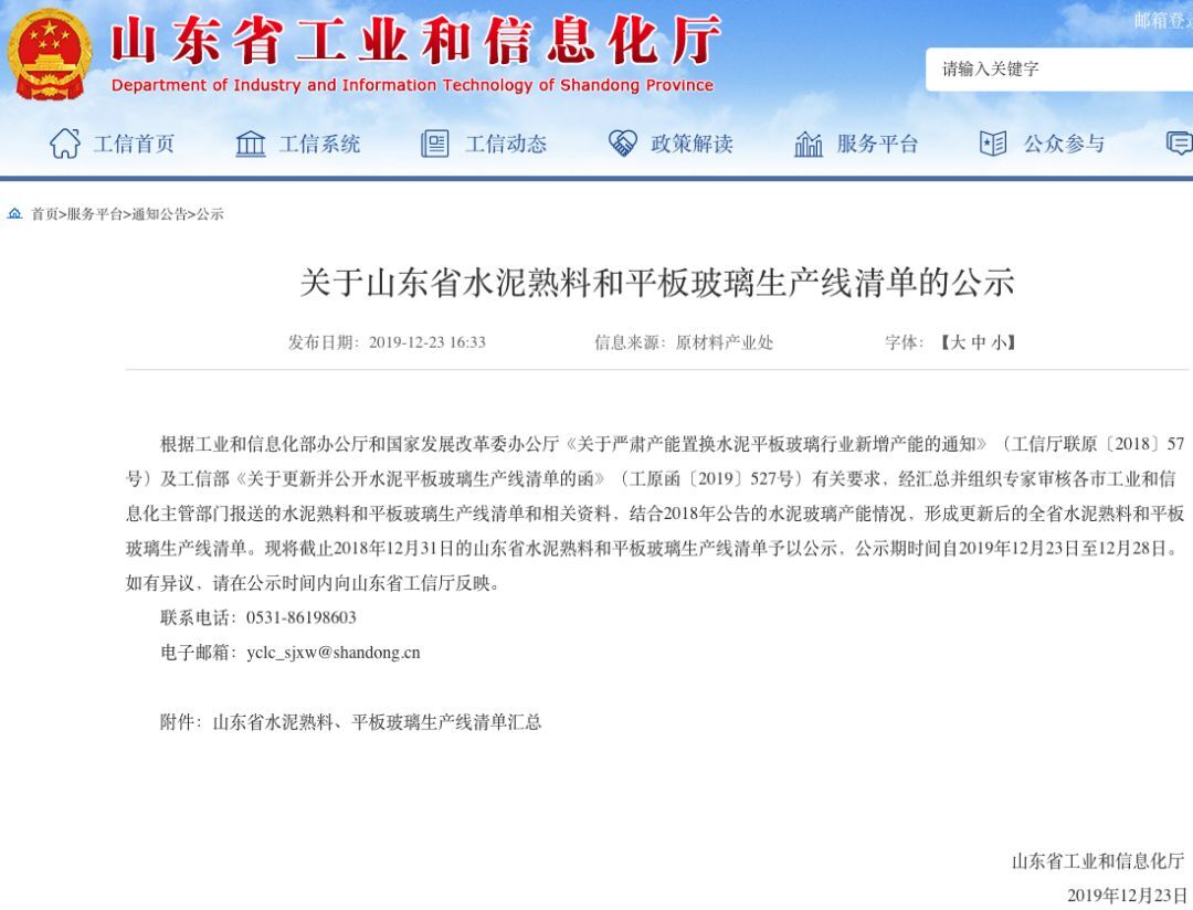 12月23日,山東省工信廳發(fā)布《關(guān)于山東省水泥熟料和平板玻璃生產(chǎn)線清單的公示》,經(jīng)匯總并組織專(zhuān)家審核各市工業(yè)和信息化主管部門(mén)報(bào)送的水泥熟料和平板玻璃生產(chǎn)線清單和相關(guān)資料,結(jié)合2018年公告的水泥玻璃產(chǎn)能情況,形成更新后的全省水泥熟料和平板玻璃生產(chǎn)線清單。