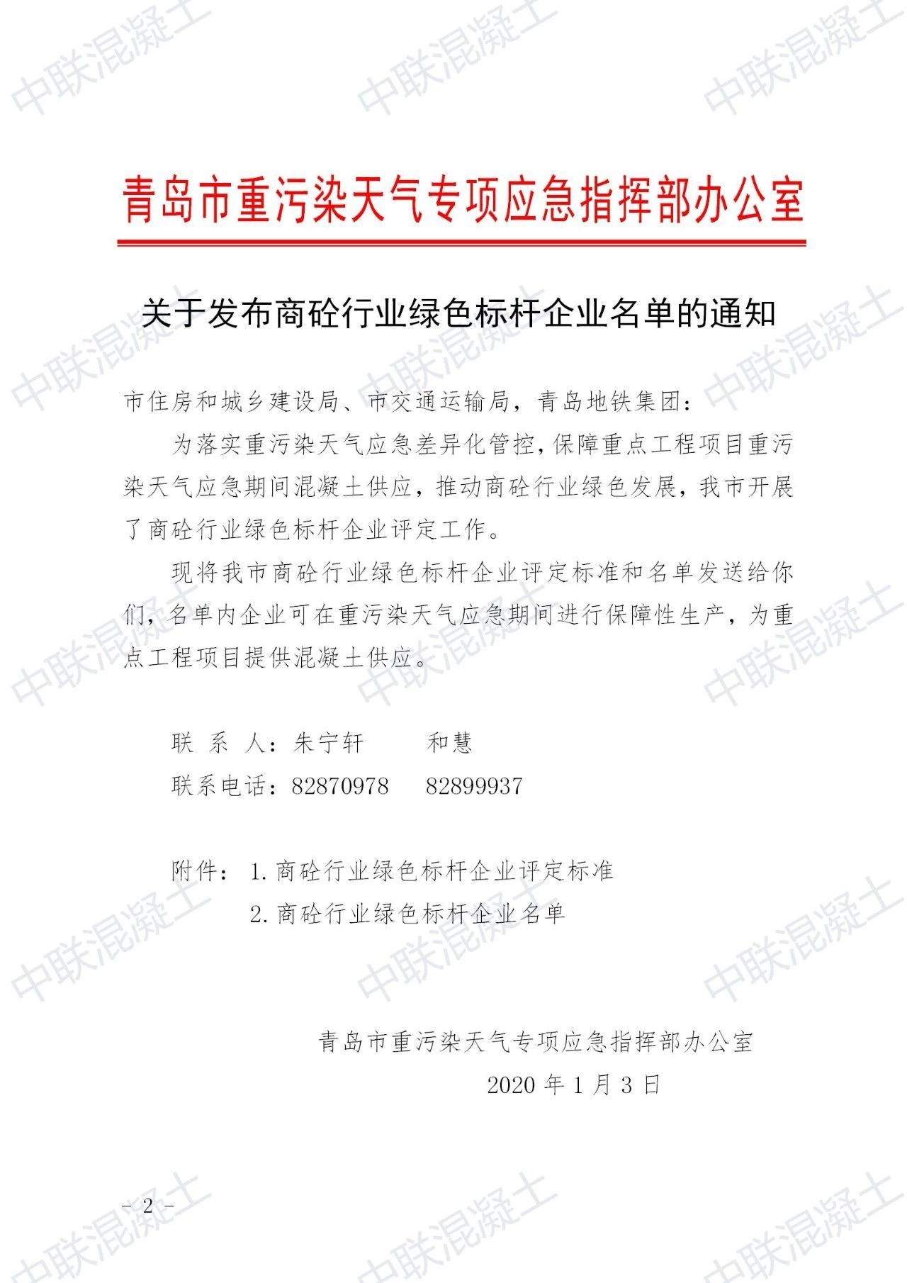 2020年1月3日,青島市重污染天氣專項應(yīng)急指揮部辦公室發(fā)布商砼行業(yè)綠色標桿企業(yè)名單,全市170余家混凝土企業(yè)僅有15家通過評定,青島中聯(lián)混凝土和城陽分公司獨占2席。
