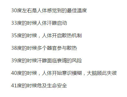 ②全身性高溫反應(yīng):人在高溫環(huán)境中停留時間較長,體溫會漸漸升高,當局部體溫高達38℃,便會產(chǎn)生不舒適反應(yīng)。人的深部體溫通常以肛溫為代表。人在休息時主訴可耐受的肛溫38.4~38.6℃,在體力勞動時為38.5~38.8℃。高溫極端不舒適反應(yīng)的肛溫臨界值為39.1~39.4℃。肛溫超過這一限度,汗率和皮膚熱傳導量都不再上升,表明人體對高溫的適應(yīng)能力已達到極限。如果溫度再繼續(xù)升高,即會出現(xiàn)生理危象。全身性高溫的主要癥狀為:頭暈、頭痛、胸悶、心悸、視覺障礙(眼花)、惡心、嘔吐、癲癇樣抽搐等。溫度過高還會引起虛脫、肢體強直、大小便失禁、暈厥、燒傷、昏迷,直至死亡。