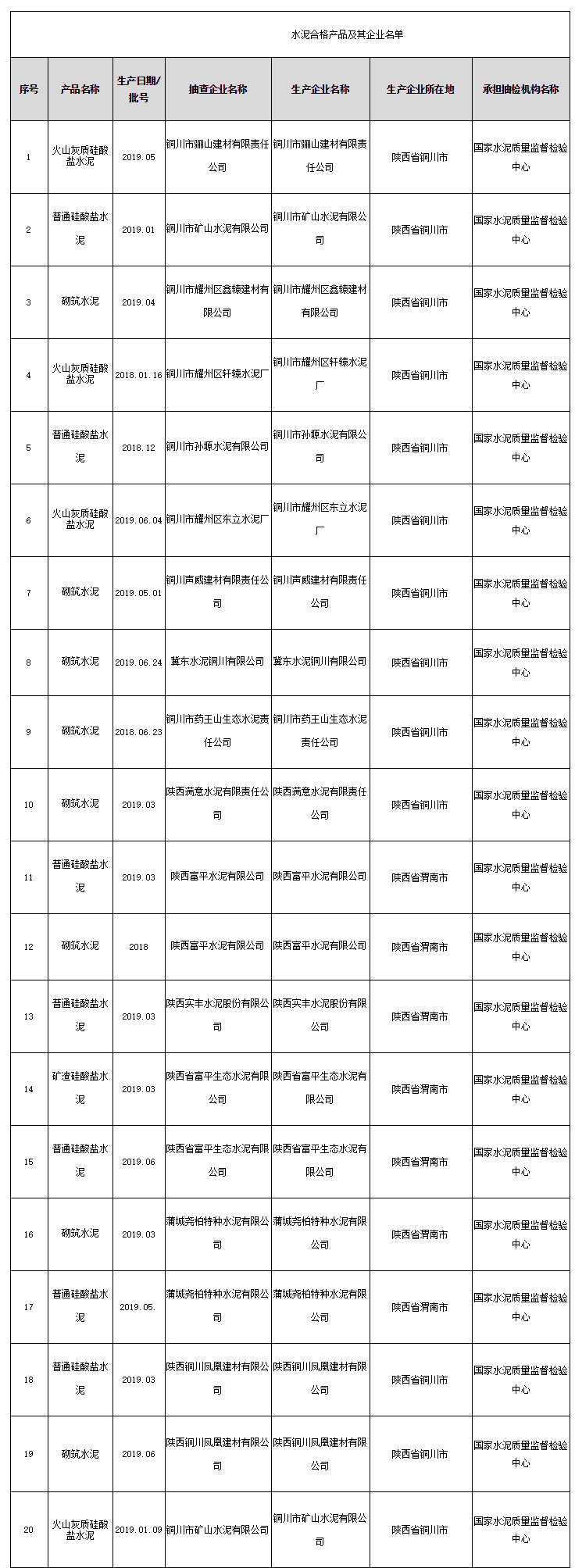 2020年3月31日,陜西省市場監(jiān)督管理局網站公布水泥產品質量監(jiān)督抽查結果。此次水泥產品在銅川、渭南等地的生產領域中抽取,共抽查生產企業(yè)15家,抽取樣品20批次,經檢驗,合格樣品20批次。