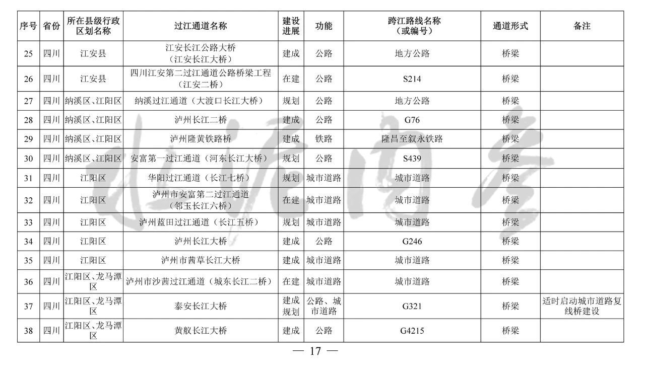 四川省(10座):雞翅膀大橋、臨港掛弓山長江大橋、羅龍過江通道、納溪過江通道(大渡口長江大橋)、安富第一過江通道(河?xùn)|長江大橋)、瀘州藍田過江通道(長江五橋)、瀘遵過江通道、新路口過江通道、合江新城過江通道(白沙長江大橋)、榕山過江通道(榕山長江大橋)