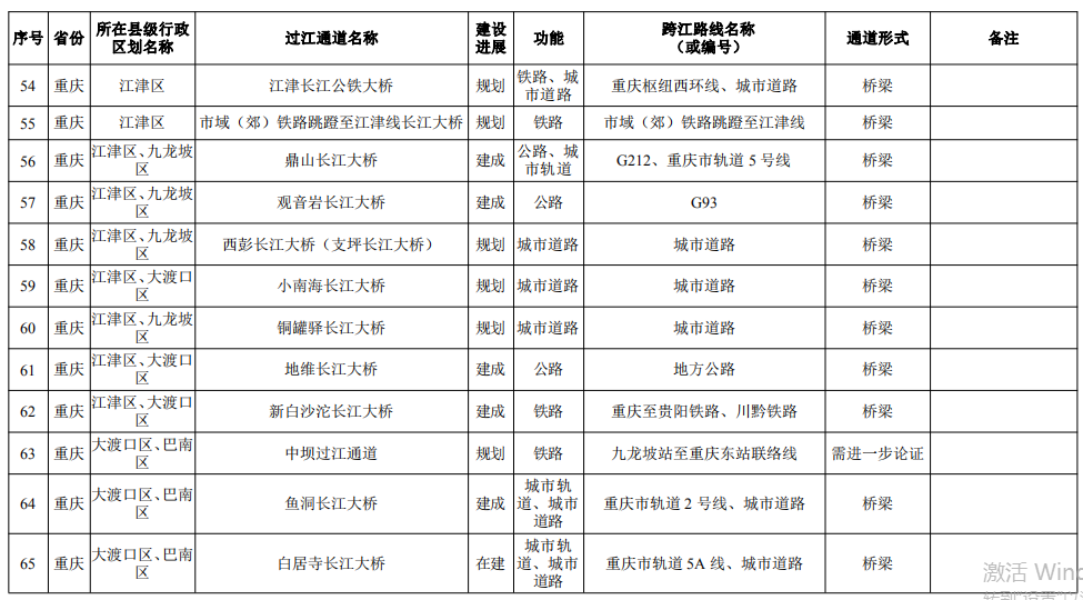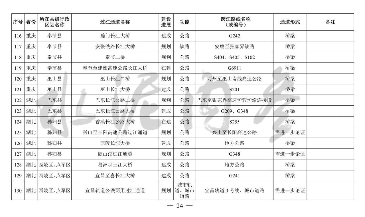 重慶市(17座):市域(郊)鐵路跳蹬至江津線長江大橋、西彭長江大橋(支坪長江大橋)、小南海長江大橋、中壩過江通道、黃桷坪長江大橋、軌道27號線過江通道、重慶至黔江鐵路過江通道、黃桷沱大橋、長壽長江三橋、涪陵石沱長江大橋、涪陵龍頭港長江大橋、涪陵江北長江大橋、興義長江大橋、西沱長江大橋、云陽復(fù)興長江大橋、奉節(jié)二橋、巫山長江二橋