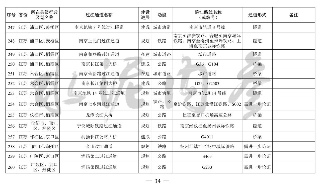 江蘇省(13座):錦文路過江通道、南京地鐵4號線過江通道、南京市域快速軌道過江通道、南京上元門過江通道、南京七鄉(xiāng)河過江通道、龍?zhí)堕L江大橋、寧儀城際鐵路過江通道、潤揚第二過江通道、江陰第二過江通道、江陰第三過江通道、張皋過江通道、蘇通第二過江通道、海太過江通道