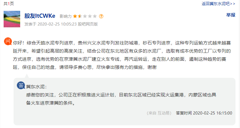 日前有股友在上市公司平臺(tái)向冀東水泥提問(wèn)并建議:稱(chēng)綜合天皓水泥專(zhuān)列進(jìn)京,貴州興義水泥專(zhuān)列發(fā)往防城港,砂石專(zhuān)列進(jìn)京,這種專(zhuān)列運(yùn)輸方式越來(lái)越蔓延開(kāi)來(lái),希望引起高層的高度關(guān)注。