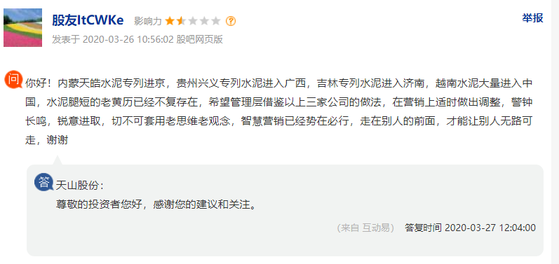 同期有投資者在上市平臺(tái)向天山股份董秘提問(wèn)并建議說(shuō):內(nèi)蒙天皓水泥專(zhuān)列進(jìn)京,貴州興義專(zhuān)列水泥進(jìn)入廣西,吉林專(zhuān)列水泥進(jìn)入濟(jì)南,越南水泥大量進(jìn)入中國(guó),水泥腿短的老黃歷已經(jīng)不復(fù)存在,希望管理層借鑒以上三家公司的做法,在營(yíng)銷(xiāo)上適時(shí)做出調(diào)整,警鐘長(zhǎng)鳴,銳意進(jìn)取,切不可套用老思維老觀(guān)念,智慧營(yíng)銷(xiāo)已經(jīng)勢(shì)在必行,走在別人的前面,才能讓別人無(wú)路可走。