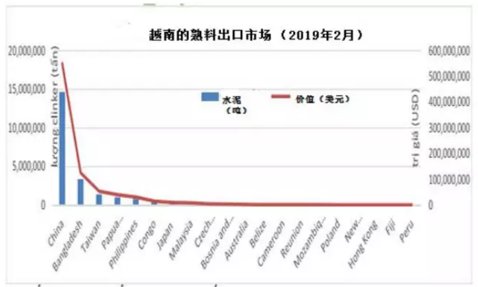 據(jù)了解,近兩年中國(guó)已經(jīng)成為為了越南水泥工業(yè)最大的銷(xiāo)售市場(chǎng)。相關(guān)數(shù)據(jù)顯示,2018年,越南向中國(guó)出口了980萬(wàn)噸水泥和熟料,占水泥和熟料出口量的近1/3。截至2019年12月,越南向全球市場(chǎng)出口了34,090,902噸水泥和熟料,包括11,401,368噸水泥和22,689,534噸熟料。