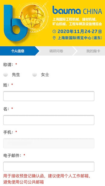 請按提示完整填寫您的個人信息。為方便您后期接受預(yù)登記確認(rèn)函、為同事注冊,請務(wù)必確認(rèn)手機(jī)、郵箱、姓名準(zhǔn)確填寫。
