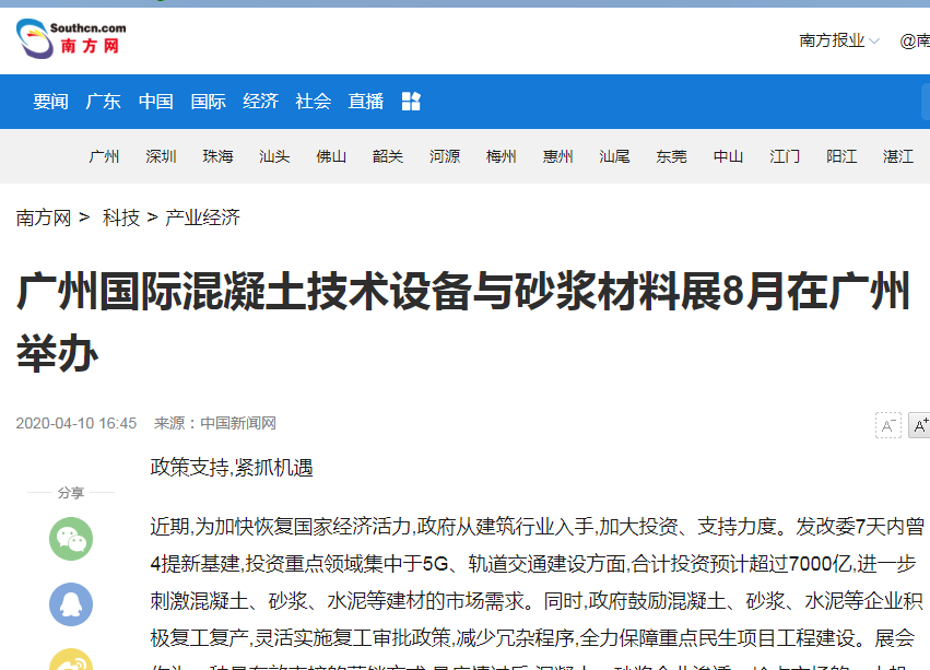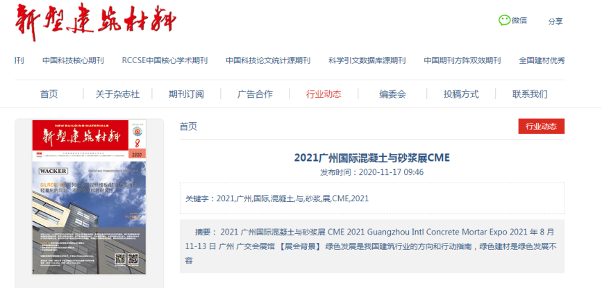 廣州國(guó)際混凝土及砂漿展已于2020年成功舉辦,自項(xiàng)目立項(xiàng)以來(lái),得到多方媒體的關(guān)注和報(bào)道。據(jù)統(tǒng)計(jì),2020-2021年度,騰訊視頻、愛(ài)奇藝、土豆網(wǎng)、優(yōu)酷視頻等電視媒體,網(wǎng)易房產(chǎn)、新浪家居、廣州搜狐焦點(diǎn)、騰訊網(wǎng)、中國(guó)數(shù)字經(jīng)濟(jì)網(wǎng)、央廣網(wǎng)、360慧聰網(wǎng)、南方網(wǎng)、北方網(wǎng)、羊城晚報(bào)、廣州日?qǐng)?bào)、新浪網(wǎng)、新京報(bào)、21世紀(jì)經(jīng)濟(jì)報(bào)道、東方網(wǎng)、光明網(wǎng)、中國(guó)商業(yè)新聞網(wǎng)、焦點(diǎn)中國(guó)網(wǎng)等主流媒體,抖音、快手、西瓜視頻、今日頭條、百家號(hào)、火山小視頻等視頻媒體和廣東建設(shè)報(bào)、中國(guó)路面機(jī)械網(wǎng)、新型砂漿網(wǎng)、世界機(jī)械網(wǎng)、工程機(jī)械在線、攪拌設(shè)備網(wǎng)、中國(guó)保溫砂漿網(wǎng)等行業(yè)媒體,以及《混凝土雜志》、《砼時(shí)代》等雜志媒體均對(duì)展會(huì)給予高度關(guān)注,積極宣傳展會(huì)動(dòng)態(tài)與資訊。感謝各行業(yè)媒體、主流媒體、視頻媒體、雜志的大力支持與高度認(rèn)可。