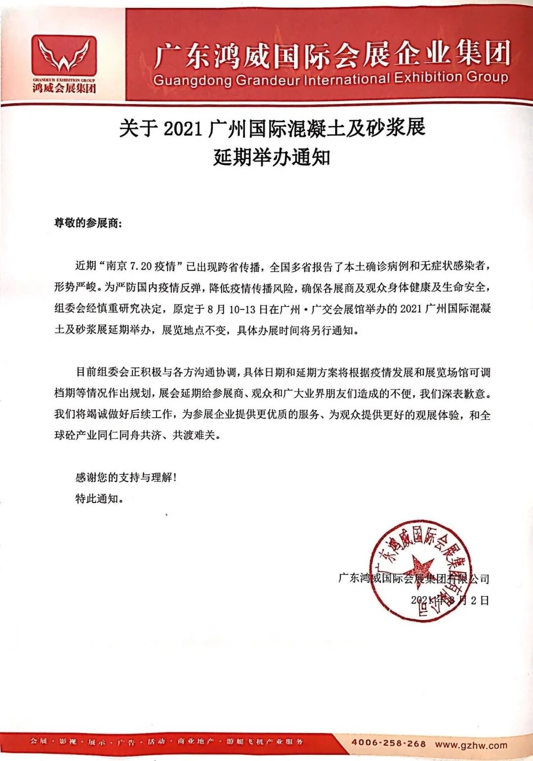 由于當前國內多地出現新型冠狀病毒肺炎新增確診病例、中高風險地區(qū)不斷增加的疫情嚴峻形勢影響,為全力配合做好疫情防控工作,避免大規(guī)模聚集和降低疫情傳播風險,保障參展商、觀眾及工作人員健康安全,維護參展單位權益,確保展會效果,組委會經慎重研究決定,原定于8月10-13日在廣州·廣交會展館舉辦的2021廣州國際混凝土及砂漿展延期舉辦,展覽地點不變,具體辦展時間將另行通知。