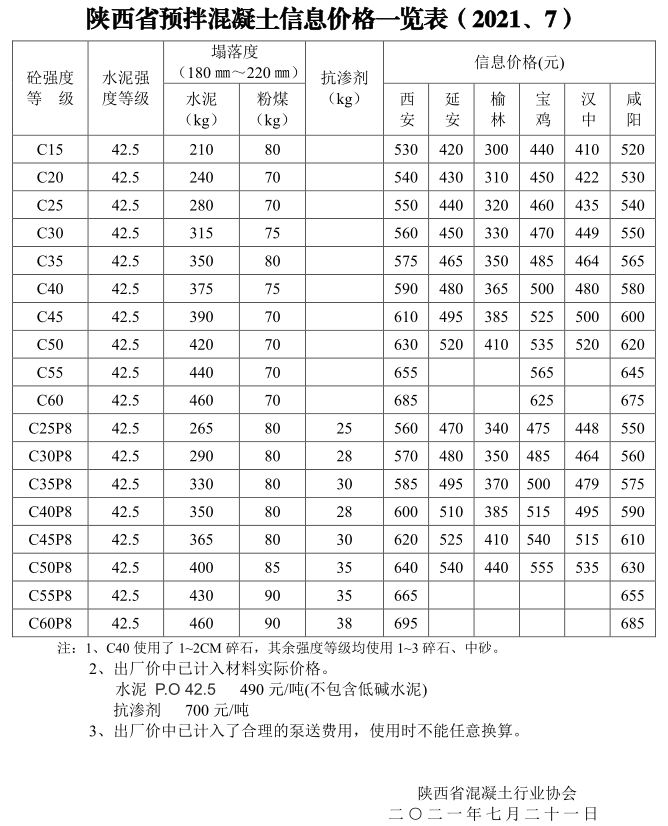 陜西省預拌混凝土信息價格一覽表(2021.7)