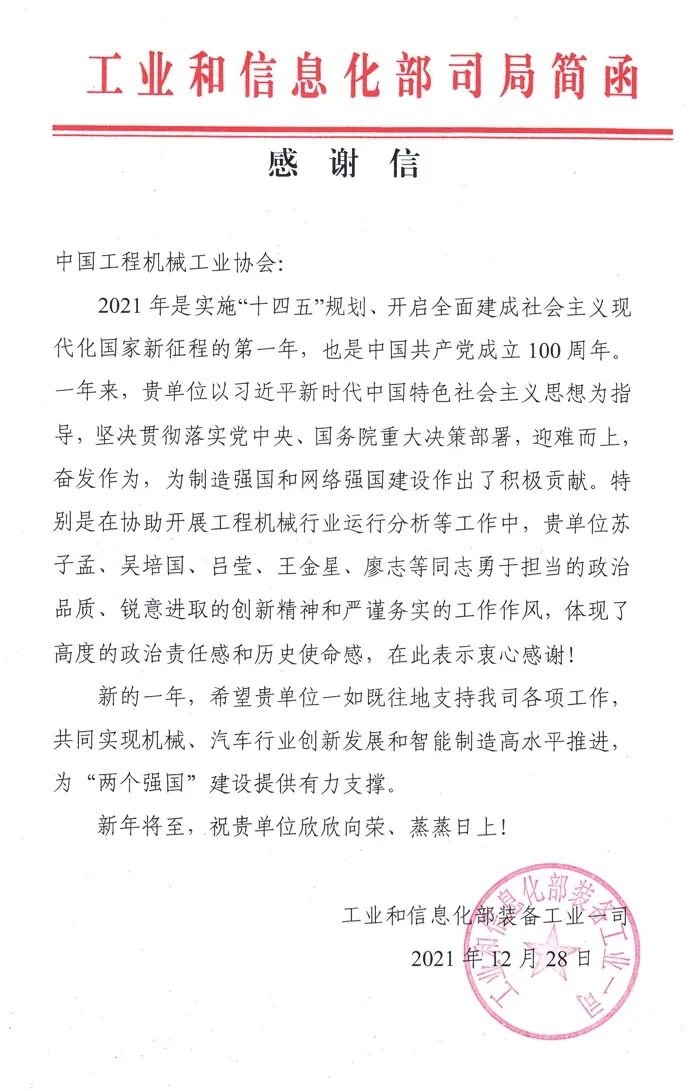 近日,工業(yè)和信息化部裝備工業(yè)一司致函中國工程機械工業(yè)協(xié)會,對協(xié)會一年來,堅持以習(xí)近平新時代中國特色社會主義思想為指導(dǎo),堅決貫徹落實黨中央、國務(wù)院重大決策部署,迎難而上,奮發(fā)作為,在制造強國和網(wǎng)絡(luò)強國建設(shè)工作,特別是積極配合協(xié)助開展工程機械行業(yè)運行分析等工作表示感謝!
