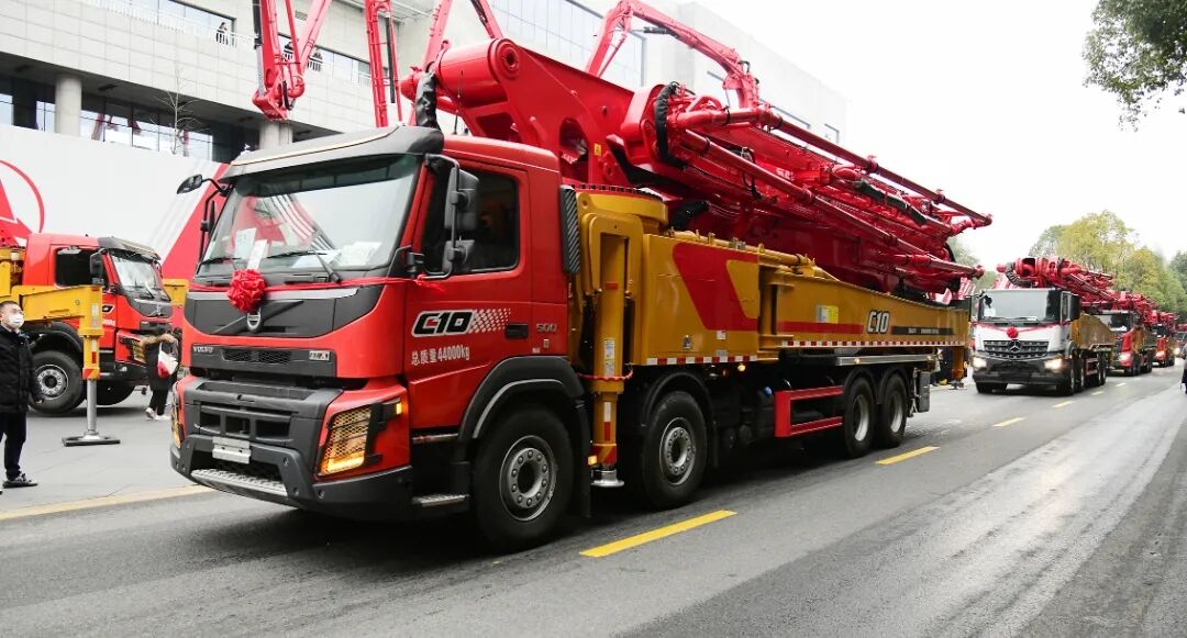 長沙廠區(qū)主干道上,66臺(tái)“世界泵王”整裝待發(fā),接受現(xiàn)場各位領(lǐng)導(dǎo)和來賓的檢閱。本次發(fā)貨的產(chǎn)品涵蓋37米、43米、56米等多款明星產(chǎn)品,更有S系列泵車的大力加持,大部分為國六新品。
