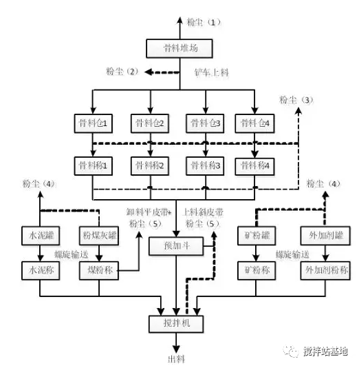 混凝土生產(chǎn)過程中主要粉塵分布及形成如下圖所示: