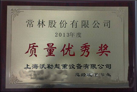 因常林股份公司在交貨期、產(chǎn)品質(zhì)量等方面的優(yōu)秀表現(xiàn),在知名的裝卸設(shè)備制造商上海沃勒起重設(shè)備有限公司2013年度供應(yīng)商會(huì)議上,被評(píng)為優(yōu)秀供應(yīng)商,榮獲質(zhì)量?jī)?yōu)秀獎(jiǎng)。