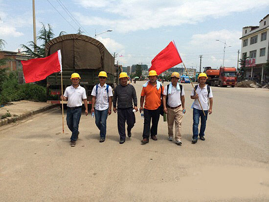 據(jù)柳工云南魯?shù)榫葹膽毙》株犌胺阶钚孪ⅲ毫ぞ葹膽毙》株?月6日上午7點30分,從昭通向震中重災區(qū)龍頭山鎮(zhèn)出發(fā)。10點到達交通管制區(qū),從這里進入災區(qū),除武警部隊、運送物資和傷員的車輛,其他車輛均不允許進入。柳工救災應急小分隊決定徒步進去,全程約36公里。經(jīng)過近7個小時的艱難跋涉,翻山越嶺,躲避塌方,小分隊于下午5時到達此次地震最嚴重的龍頭山鎮(zhèn)。