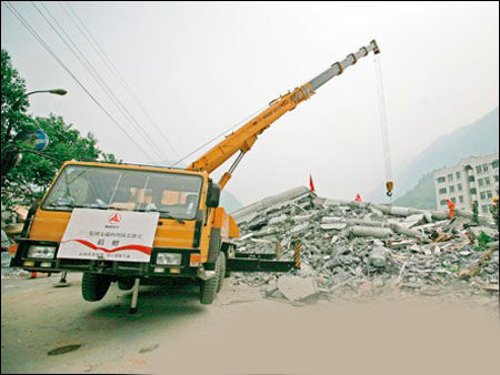 三一7臺挖掘機、8臺起重機以及80多名具有設(shè)備操作經(jīng)驗的青年員工組成抗震救災(zāi)志愿者突出隊,受命開赴災(zāi)區(qū)。