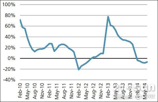 2014年上半年,商品房銷售面積累計(jì)下降6%,銷售額下降7%,房屋新開工面積累計(jì)同比下降16.5%;房屋施工面積累計(jì)同比增長(zhǎng)11.3%,增速較2013年的16.1%明顯下降。展望2014年下半年,由于2013年下半年商品房銷售面積達(dá)7.9億平米,絕對(duì)水平較高,因此該行預(yù)計(jì)下半年銷售面積下降幅度有擴(kuò)大的可能,從而壓制開發(fā)商的房地產(chǎn)建設(shè)活動(dòng)。