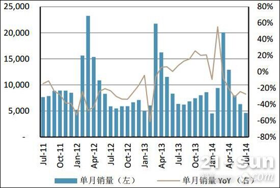 瑞銀表示,行業(yè)整體景氣度并未好轉(zhuǎn),下滑之勢(shì)未改。2013年4月開始,土方機(jī)械單月銷量增速由負(fù)轉(zhuǎn)正,其中挖機(jī)銷量在2013年四季度實(shí)現(xiàn)了超過20%的增長(zhǎng),裝載機(jī)在8月后亦實(shí)現(xiàn)了超過15%的月均銷量增長(zhǎng)。但進(jìn)入2014年以來,由于房地產(chǎn)銷售及新開工不佳,2014年3月,挖掘機(jī)和裝載機(jī)銷量分別下滑8%和4%,結(jié)束了11個(gè)月的正增長(zhǎng)。此后4-7月,跌幅持續(xù)擴(kuò)大,其中7月挖機(jī)銷量下降27%,裝載機(jī)銷量下滑20%。
