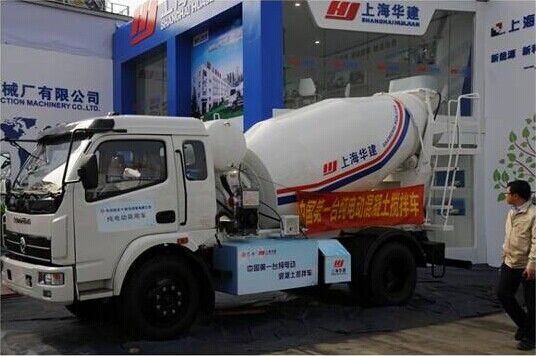 上海華建2014款東風底盤純電動4m3攪拌運輸車,可以名符其實的成為中國第一輛純電動混凝土攪拌運輸車。一次充電可行駛40公里,快充過程30分鐘即可充滿。