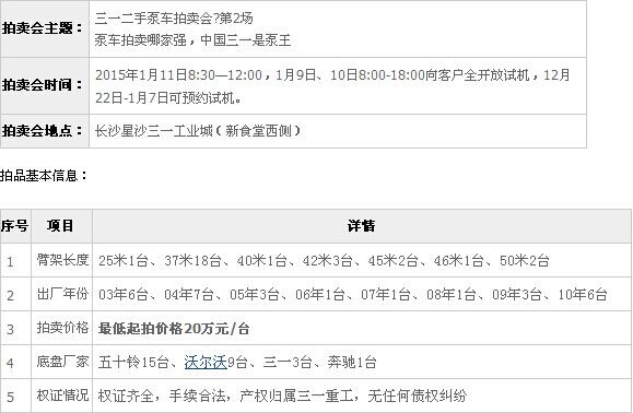 泵車拍賣會第2場將于2015年1月11日在湖南長沙三一工業(yè)城舉行。