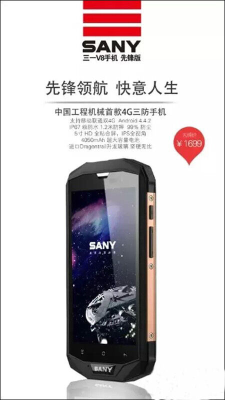 新一代的SANY V8手機(jī)是三一集團(tuán)與國(guó)際知名公司共同研發(fā)訂制的專(zhuān)業(yè)戶(hù)外三防手機(jī),達(dá)到國(guó)際IP67標(biāo)準(zhǔn)的防水、防塵和防震功能,同時(shí)該手機(jī)擁有1300MP像素高清拍照鏡頭,日本Dragontrail 升龍防壓防刮玻璃,5.0吋HD IPS全視角顯示頻,14.88毫米超薄合金機(jī)身,4050毫安時(shí)超大電池等亮點(diǎn)配置。該款手機(jī)設(shè)計(jì)源自德國(guó),硬朗挺拔的外形設(shè)計(jì)非常獨(dú)特;手機(jī)心臟來(lái)自美國(guó)高通公司,內(nèi)置4核1.2G高速處理器,自帶1GB DDR3 RAM,8GB ROM,搭載了安卓系統(tǒng)4.4 kitkat原裝版本運(yùn)行軟件;手機(jī)采用了日本進(jìn)口的5.0吋Dragontrail升龍玻璃,不僅適合單手操作,而且玻璃經(jīng)過(guò)了鋼化,比蘋(píng)果手機(jī)的硬度高30倍;手機(jī)配備1300萬(wàn)高清攝像頭,支持水下拍攝和視頻播放;手機(jī)電池專(zhuān)為戶(hù)外群體考慮,達(dá)到了驚人的4050毫安時(shí),官方表示能夠提供 10小時(shí)通話和288小時(shí)的待機(jī)時(shí)間??芍С蛛p4G流暢通話,TDD-LTE 4G(移動(dòng)4G,移動(dòng)2G)和FDD-LTE 4G網(wǎng)絡(luò)(聯(lián)通4G/3G/2G)、Wi-Fi、GPS以及microSD卡擴(kuò)展等功能。SANY V8先鋒手機(jī)的機(jī)身尺寸是155x80x14.8mm,重約238g。同時(shí),手機(jī)將提供沙漠金、星空黑和三一紅三種不同的配色,完美展現(xiàn)工程之美。