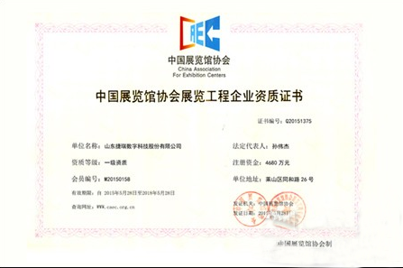 2015年5月28日,山東捷瑞數(shù)字科技股份有限公司順利通過中國展覽館協(xié)會的審核,正式被認定為中國展覽展示行業(yè)最高資質(zhì):展覽工程企業(yè)一級資質(zhì),并獲得中國展覽館協(xié)會頒發(fā)的資質(zhì)證書。