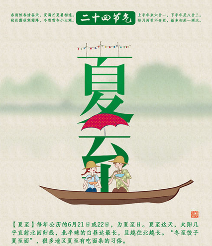 夏至是二十四節(jié)氣中最早被確定的一個(gè)節(jié)氣。公元前七世紀(jì),先人采用土圭測(cè)日影,就確定了夏至。每年的夏至從6月21日(或22日)開(kāi)始,至7月7日(或8日)結(jié)束。據(jù)《恪遵憲度抄本》:“日北至,日長(zhǎng)之至,日影短至,故曰夏至。至者,極也?!毕闹吝@天,太陽(yáng)直射地面的位置到達(dá)一年的最北端,幾乎直射北回歸線(北緯23°26\'),北半球的白晝達(dá)最長(zhǎng),且越往北晝?cè)介L(zhǎng)。如海南的海口市這天的日長(zhǎng)約13小時(shí)多一點(diǎn),杭州市為14小時(shí),北京約15小時(shí),而黑龍江的漠河則可達(dá)17小時(shí)以上。夏至以后,太陽(yáng)直射地面的位置逐漸南移,北半球的白晝?nèi)諠u縮短。民間有“吃過(guò)夏至面,一天短一線”的說(shuō)法。而此時(shí)南半球正值隆冬。