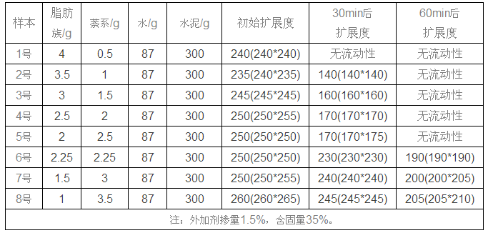 筆者將通過(guò)脂肪族與萘系復(fù)配,探討與淮南“海螺牌”水泥的適應(yīng)性實(shí)驗(yàn),對(duì)比兩者的優(yōu)略,從不同的比例中找出效果理想且經(jīng)濟(jì)實(shí)用的最優(yōu)組合。本次實(shí)驗(yàn)所用的淮南“海螺牌”水泥的熟料使用新型干法旋窯生產(chǎn)P.O42.5普通硅酸鹽水泥,其中三氧化硫含量為2.09%;氧化鎂含量為1.91%;氯離子含量為0.016%;混合材品種為碎屑+煤矸石,摻量12.53%;石膏為脫硫石膏,摻量4.97%,水泥初凝170min,終凝220min。脂肪族為某單位生產(chǎn)的普通脂肪族外加劑,固含量為35%,減水率24%,密度1.195g/cm3。萘系為袋裝萘粉,稀釋到含固量為35%(含固量與脂肪族的相同,方便做對(duì)比實(shí)驗(yàn))。脂肪族外加劑(免加熱型)在合成過(guò)程中使用氫氧化鈉提供熱源,導(dǎo)致脂肪族外加劑含堿量相對(duì)較高;而萘系在合成過(guò)程中,首先加入濃硫酸磺化,在水解中和反應(yīng),因而萘系外加劑中硫酸根離子含量相對(duì)較高。