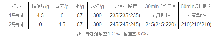為了初步判斷這兩種外加劑對(duì)海螺牌水泥的適應(yīng)性問(wèn)題,首先調(diào)和成同樣固含量為的溶液,實(shí)驗(yàn)數(shù)據(jù)詳見(jiàn)表1: