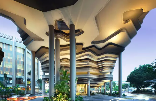 建筑流動(dòng)的幾何體給人一種高聳入云之感,塔樓每隔三層客房擁有懸挑的空中花園,上面種滿了熱帶植物,它已成為城市綠地的一部分,與鄰近公園融為一體。酒店擁有自我遮陽功能,懸挑而出的空中花園和相鄰的三座酒店客房大樓都能起到遮陽的作用,客房樓層立面采用低輻射玻璃。酒店頂樓的屋頂花園可將全城風(fēng)光一覽無余,獨(dú)家蘭花貴賓會(huì)所位處該層,并配有私人會(huì)議空間、圖書館和專用的貴賓會(huì)所門房。酒店五層設(shè)有可俯瞰城市的無邊界泳池,設(shè)備先進(jìn)的健身中心,特色的鳥籠休息涼亭及長達(dá)300米花園走道。